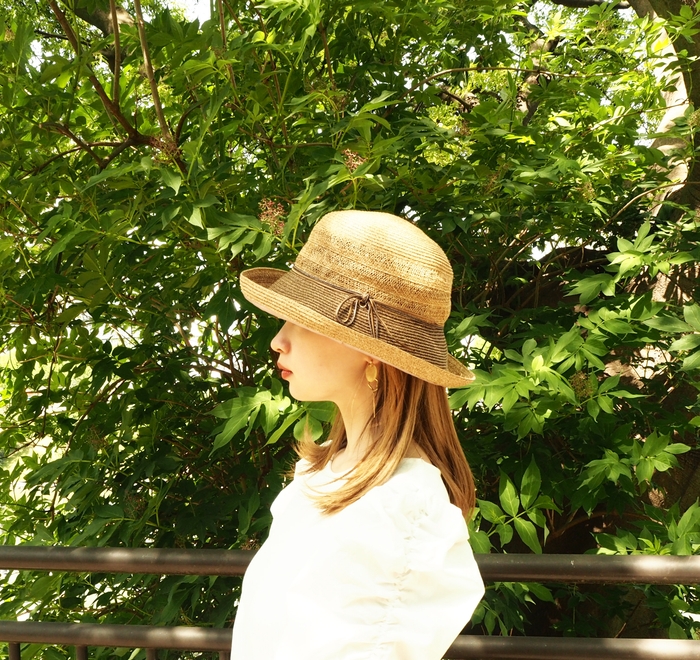 夏のワンピースに似合うような涼しげなデザインだけでなく、つば部分には遮熱素材を採用。