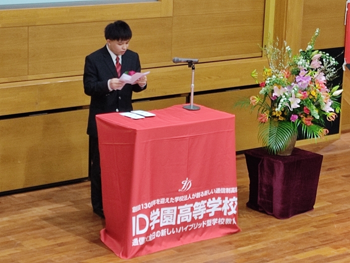 卒業生代表挨拶では、「ID学園高等学校での社会探求などの実践的な授業を通じて、自分が社会に対して何ができるかということを深く追求することができ、社会で生きぬくためのすべを学ぶことができました。ID学園高等学校で育んだ教えを胸に、これからも一歩一歩自分らしく歩んでいきたいです」とう力強い決意が述べられました。