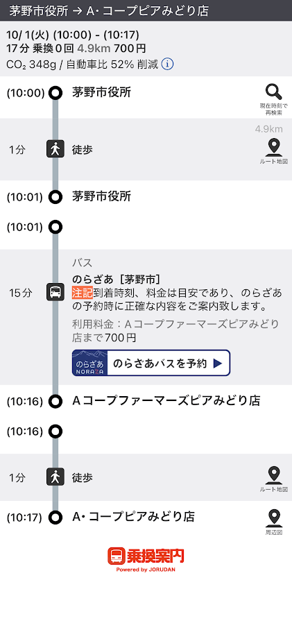 ジョルダン株式会社(本社:東京都新宿区、代表取締役社長:佐藤俊和、以下「ジョルダン」)は、2024年10月1日(火)より、ジョルダンが提供するスマートフォン向けアプリ「乗換案内」の経路検索にて、新たな移動手段として長野県茅野市で運行されているAI乗合オンデマンド交通「のらざあ」(システム:「Via Mobility Japan」製)の案内を開始しました。