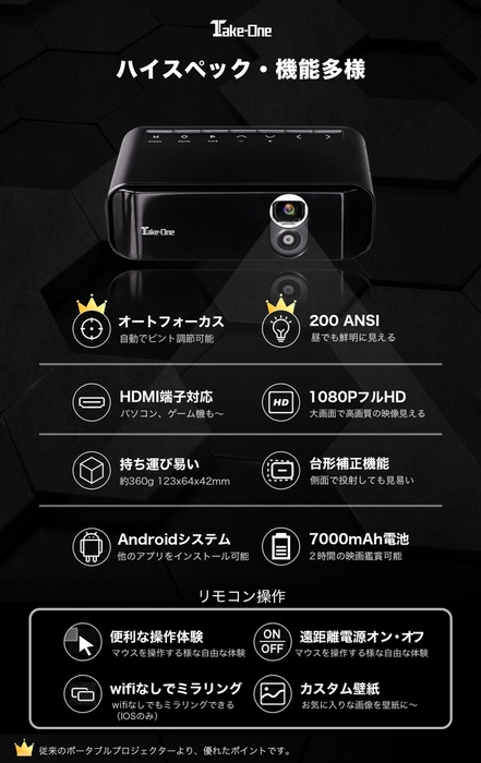 テイクワンテクノロジー株式会社(本社:東京都港区)は、自社ブランド「Take-One」の新商品「オートフォーカス搭載高画質プロジェクターT80」を2020年11月5日よりクラウドファンディングサイトMakuakeにて先行予約販売を開始しました。