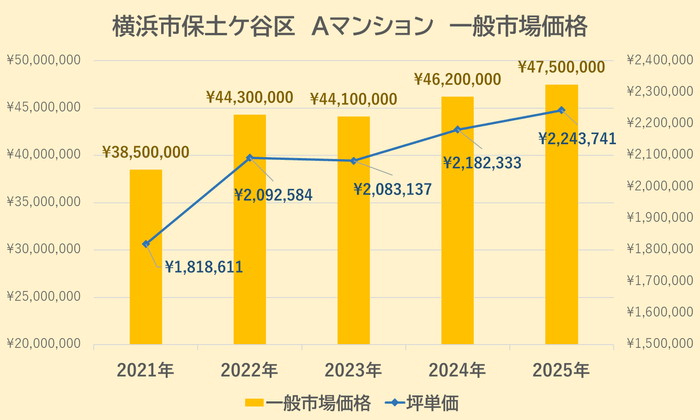 Aマンションの一般市場価格・坪単価の推移は上記【図3】の通りです。
