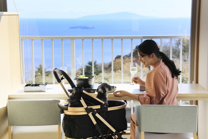 当館は熱海ならではの温泉と食事に加え、海を望むルーフトップドッグランやわんちゃん用ビュッフェ、復元ドライヤー完備のトリミングルームなど愛犬のヘルスケアにも寄り添ったコンテンツを取り揃えています。