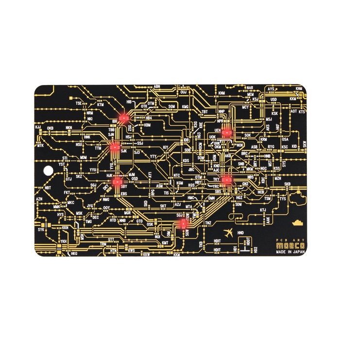 基板CADで、表は東京回路線図(または関西回路線図)デザイン、裏は基板デザインを設計しました。基板の配線パターン(金メッキ)で路線図をデザインしています。飛行場には飛行機マーク、海には大型船が浮かんでいます。