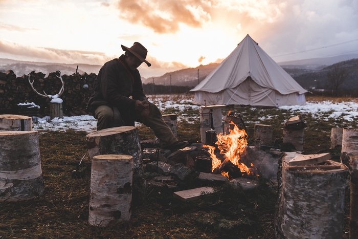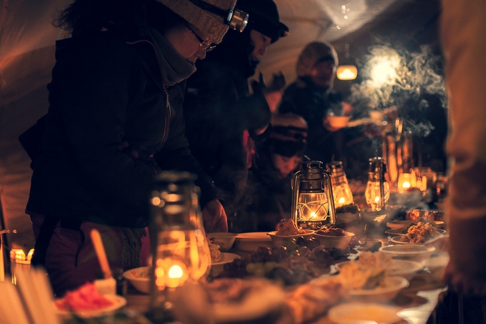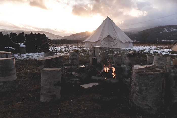 終り火とは、あと数日で秋が終り、雪の気配がすぐそこに感じられる頃、アウトドアにおけるグリーンシーズン最後の日として集まる会です。手軽に作れるクラフト体験、非日常的なアウトドア料理で満天の星の下、静かに囲む焚き火でお酒と夜長を楽しみます。去年は粉雪が降る晩秋の草原で、曇り空から合間に刺す陽の光が、ゲスト達のクラフト作りを照らしていました。夜は焚き火を囲み薪の燃える音と天の川を眺めながら深酒に酔いました。さて今年は・・・。