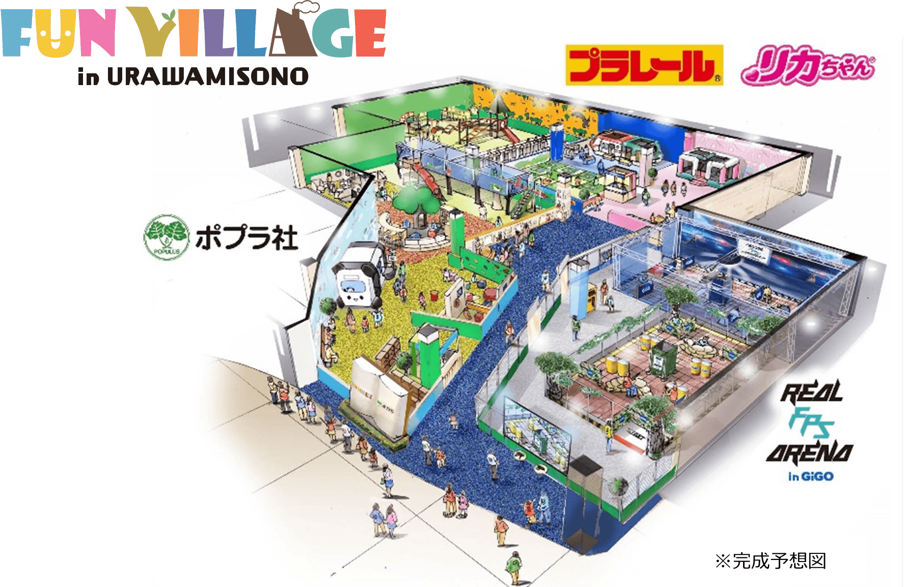 同店は、ポプラ社が出版する絵本の世界を様々なコンテンツとして体験できる、常設店としては国内初の「FUN VILLAGE with ポプラ社」をはじめ、タカラトミーの玩具ブランドを使用した店舗として国内4店舗目となる「FUN VILLAGE with プラレール・リカちゃん」、新ジャンル“フィジカルeスポーツ”を体験できる「リアルFPSアリーナ」の3つのコンテンツを展開。隣接する「GiGOイオンモール浦和美園」と合わせて様々なイベントもご用意し、ファミリー中心に幅広いお客さまが1日中楽しめる、来るたびに新しい発見がある店舗づくりを目指してまいります。