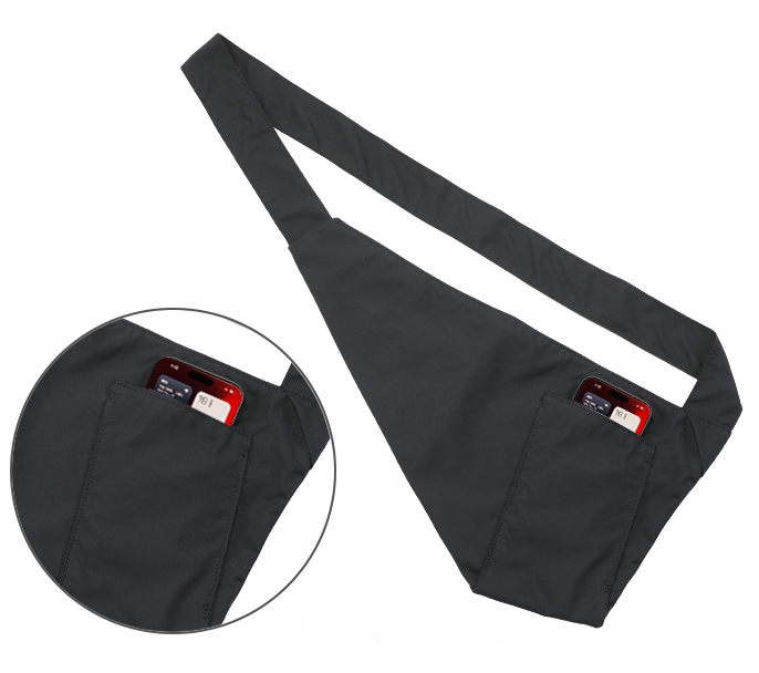ショルダー表面にはスマートフォン用のポケットが付いており、いつでもサッと取り出しが可能です。