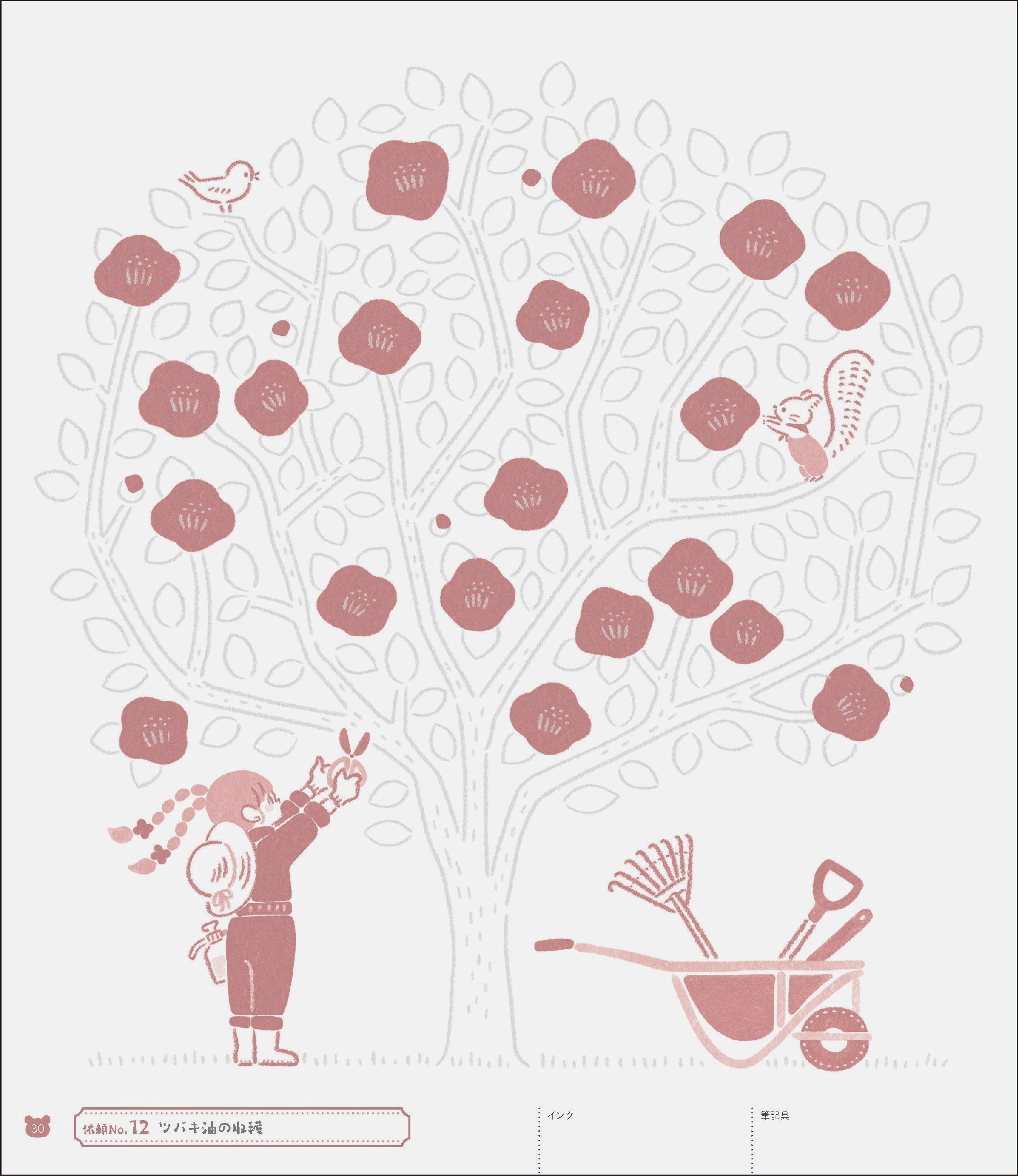 まだあまりインクを持っていない初心者さんでも楽しめるように、PART1のイラストには背景色が印刷されていて、インク1色で輪郭線をなぞるだけでイラストが完成!後半になるほど背景色はなくなり、どんどんなぞる部分が増えて難易度がアップするので、インク沼人さんにも満足いただける構成になっています。