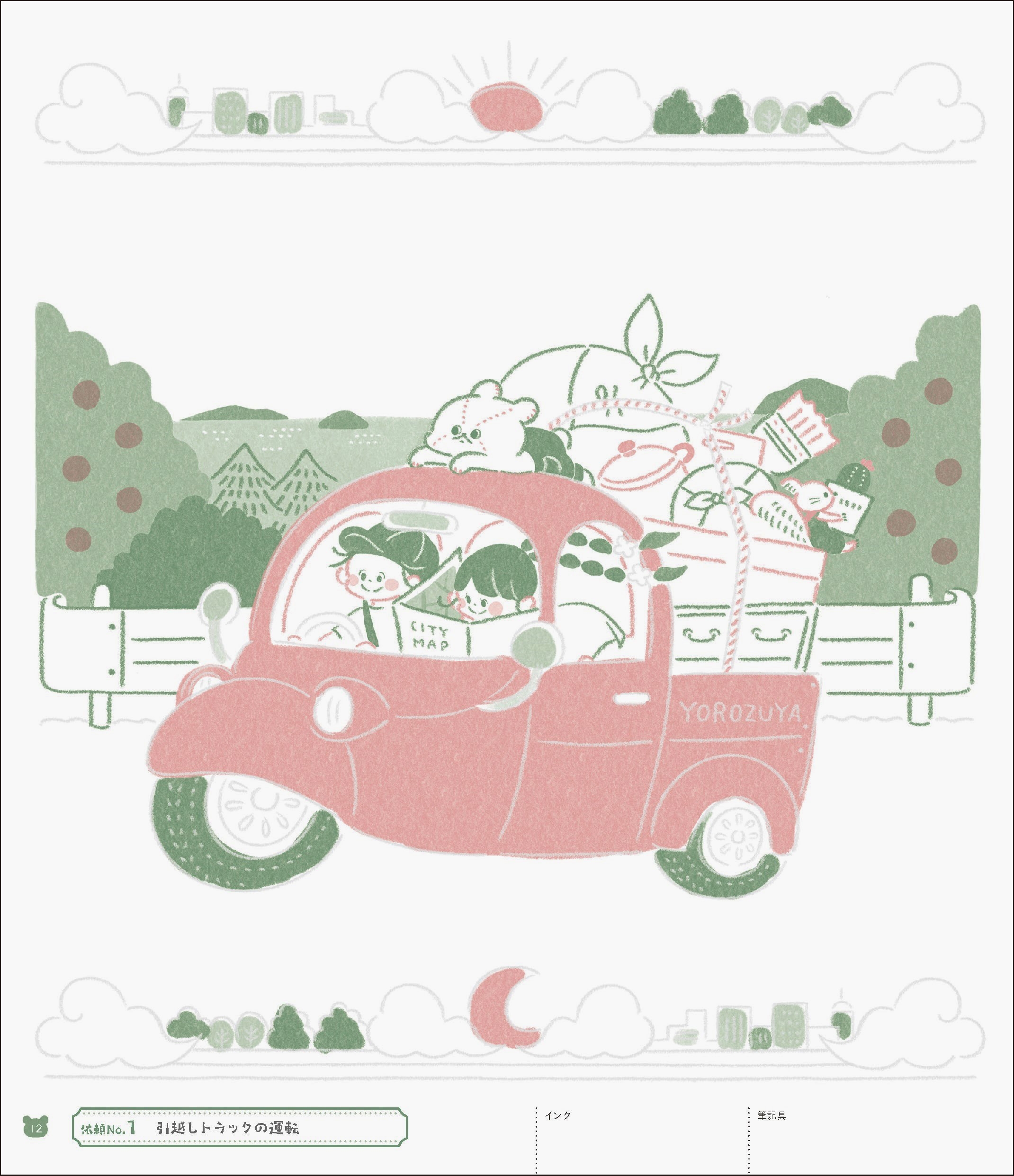 著者は多数の著書があり講師としても活躍する人気イラストレーターのカモさん。本書では、サーカステントでまいごの子猫を探したり、ガラス職人の助手をしたり、魔女の薬草を探したり……、「どんなお困りごとも解決!」がモットーのハチ、モモ、バンバン、マンのYOROZUYAの4人組が主人公。ちょっと変わった37の依頼で大活躍するようすをなぞります。文章はついていませんが、場面のようすから、バンバンたちの会話が聞こえてきそうな1冊です。