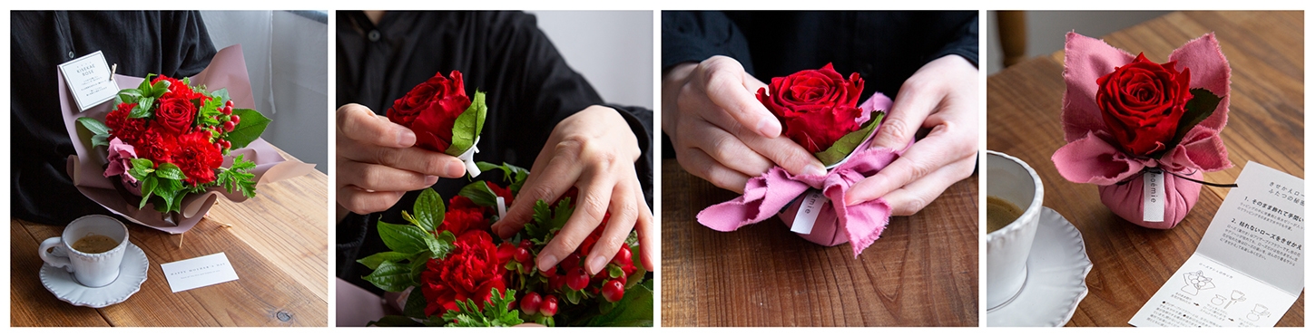 noemieは2021年に新機軸のブーケ「きせかえローズ(香りのサシェつき)」を発表。「2度楽しめる、ずっと楽しめる、まったく新しい花束」として、近年のギフトシーンで人気を博してきました。