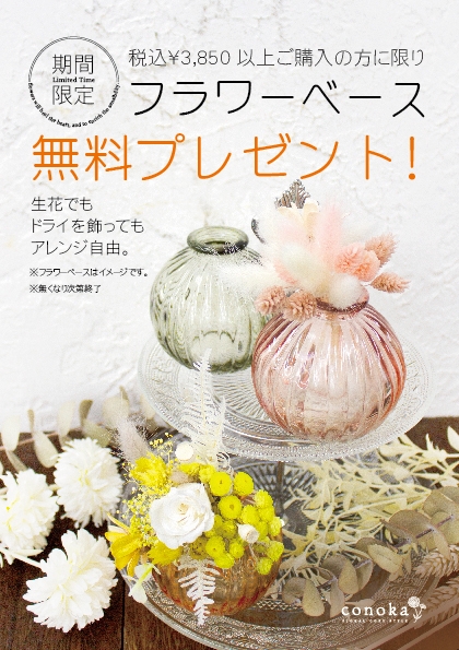 税込¥3,850以上お買い上げの方に対象のフラワーベースからお好きなものを1点プレゼントいたします。なくなり次第終了とさせていただきますので、予めご了承下さい。