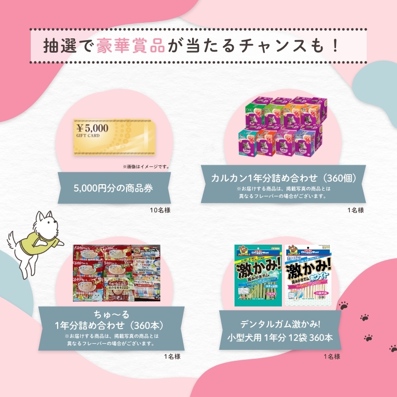 応募者の中から合計26名様に、商品券5000円やペットアイテム商品等をプレゼントいたします。