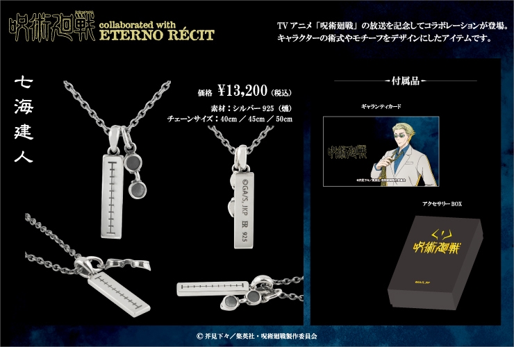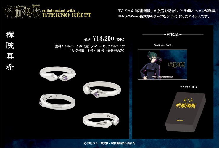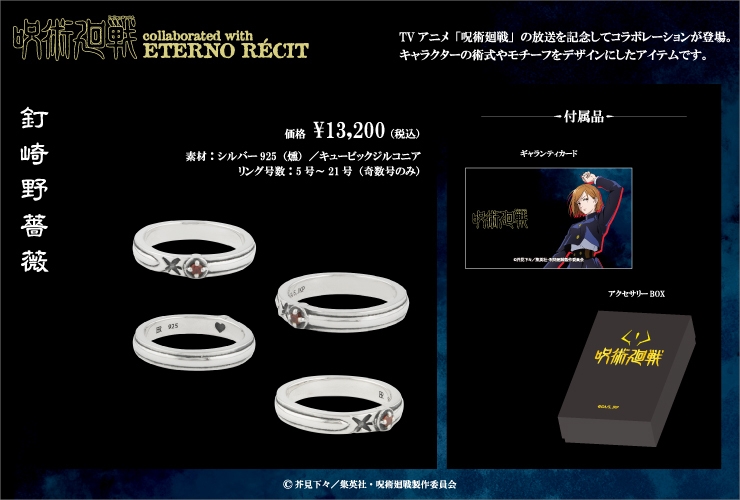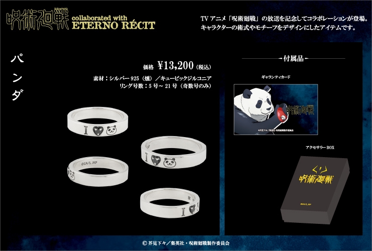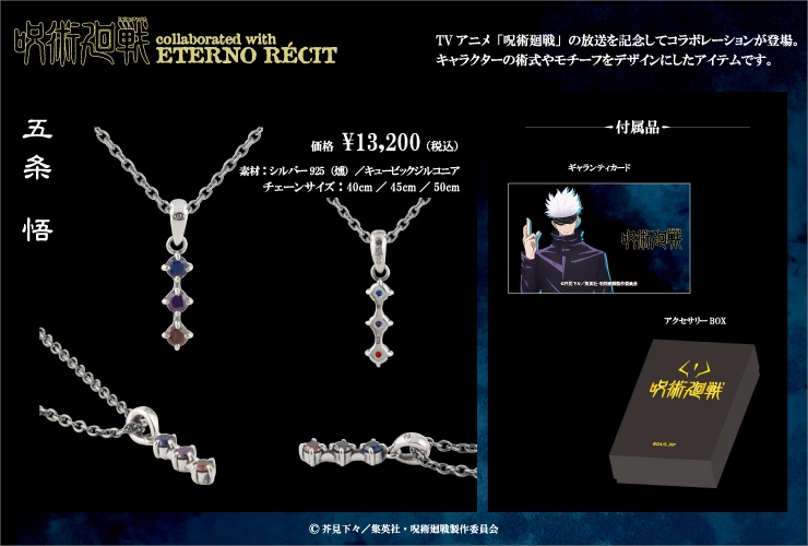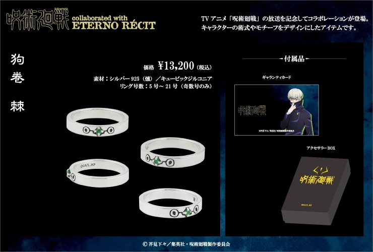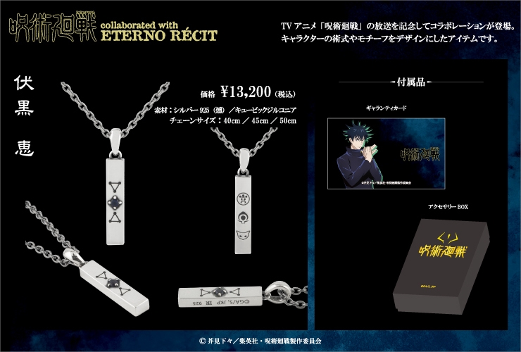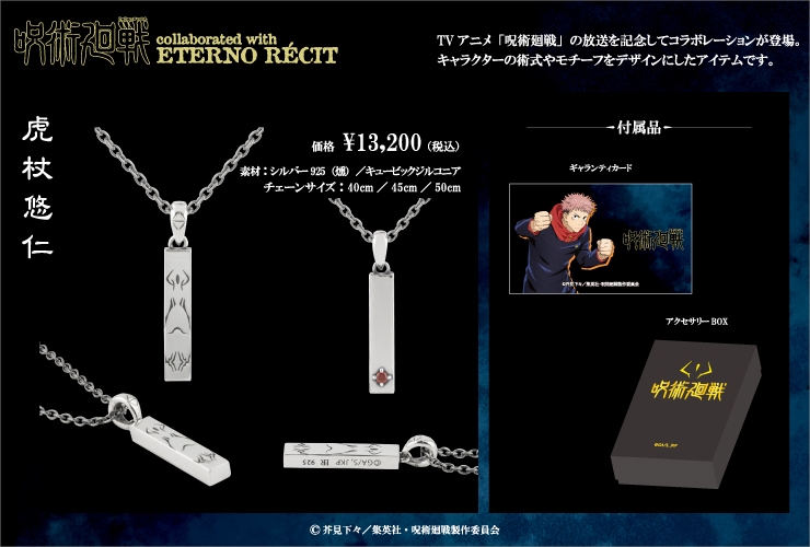 シルバーアクセサリーブランド『ETERNO RECIT(エテルノレシ)』やアニメ・ゲームなどのオリジナルグッズを手がける株式会社エテルノレシ(所在地:千葉県野田市、代表取締役:伊藤 学)より「呪術廻戦 limited shop -マルイ編-」にて販売されていた、大人気TVアニメ『呪術廻戦』のシルバーアクセサリーシリーズをエテルノレシ公式WEBショップにて期間限定で予約販売を再開します。