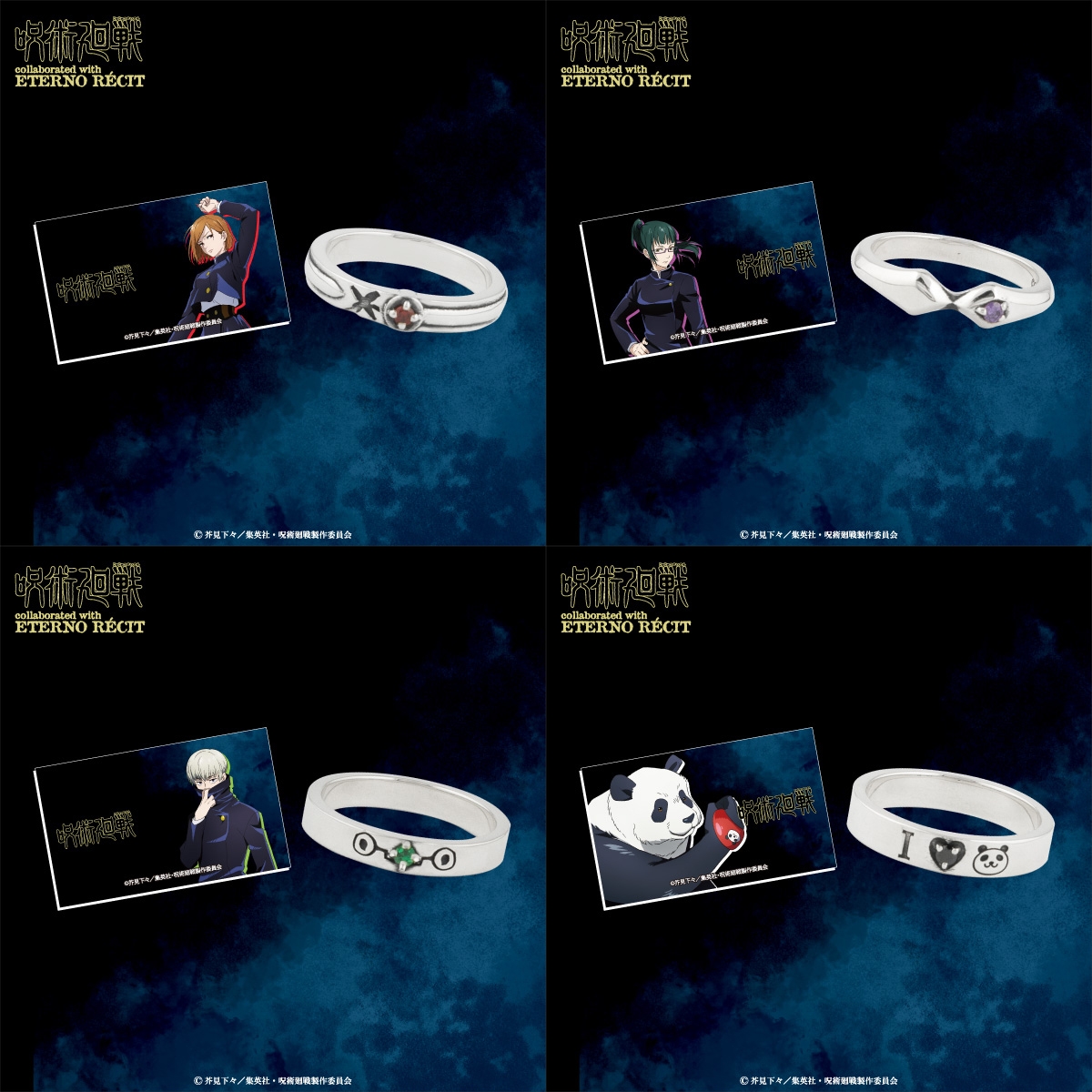 虎杖悠仁・伏黒恵・釘崎野薔薇・禪院真希・狗巻棘・パンダ・七海建人・五条悟の8名のキャラクターのイメージモチーフをふんだんにデザインしたファン必見のリングやペンダントは予約終了後も多くの再販売の声がよせられた人気アイテムで、この機会を逃すと手に入らなくなるプレミアムアイテムです。