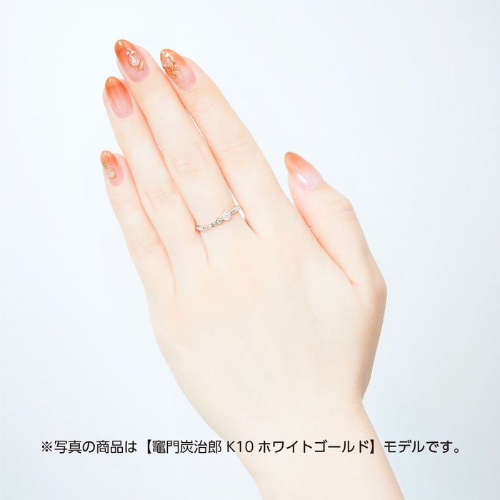 細身のウェーブタイプのリングにイメージカラーストーンをセットし、髪飾りや禰豆子の鬼化が進行した際に出る痣をデザインに取り込んだシンプルで普段使いのしやすいデザインです。
