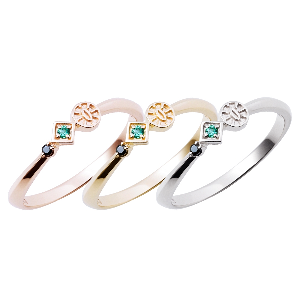 細身のウェーブタイプのリングにイメージカラーストーンをセットし、三つ編みの髪や刀の鐔をデザインに取り込んだシンプルで普段使いのしやすいデザインです。
