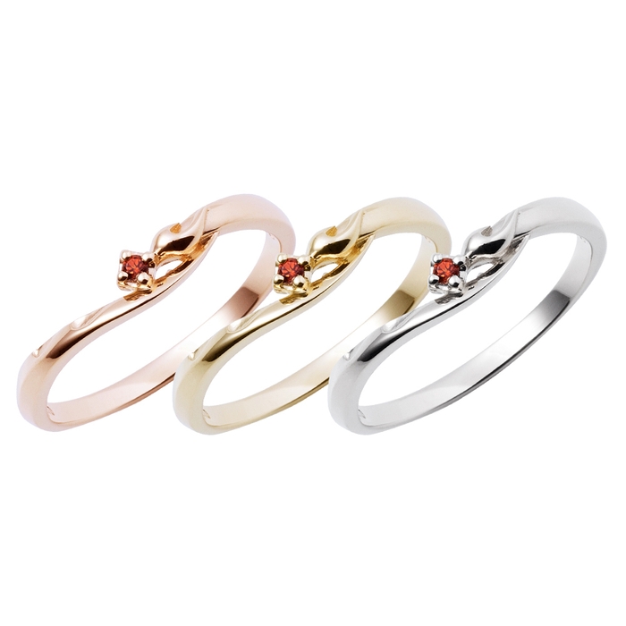 細身のウェーブタイプのリングにイメージカラーストーンをセットし、羽織の炎柄をデザインに取り込んだシンプルで普段使いのしやすいデザインです。