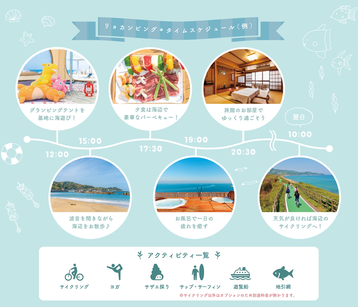 リョカンピングとは、日中はグランピングテントを基地に海遊びやアクティビティ、豪華なバーベキューなどを楽しみ、夜は旅館でゆっくり過ごすなど、アウトドアを思いっきり楽しみながらも旅館で快適に過ごせる新しい宿泊スタイルです。