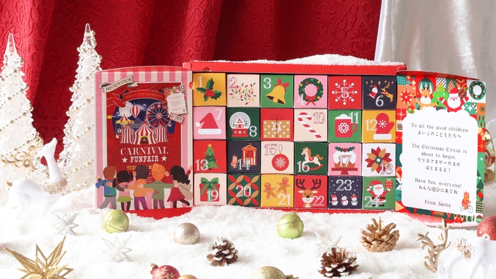 12月1日から毎日ひとつずつ小箱を開けて楽しめる、クリスマスカレンダー。サンタクロースが率いるクリスマスサーカスの様子を絵本仕立てで描いています。
