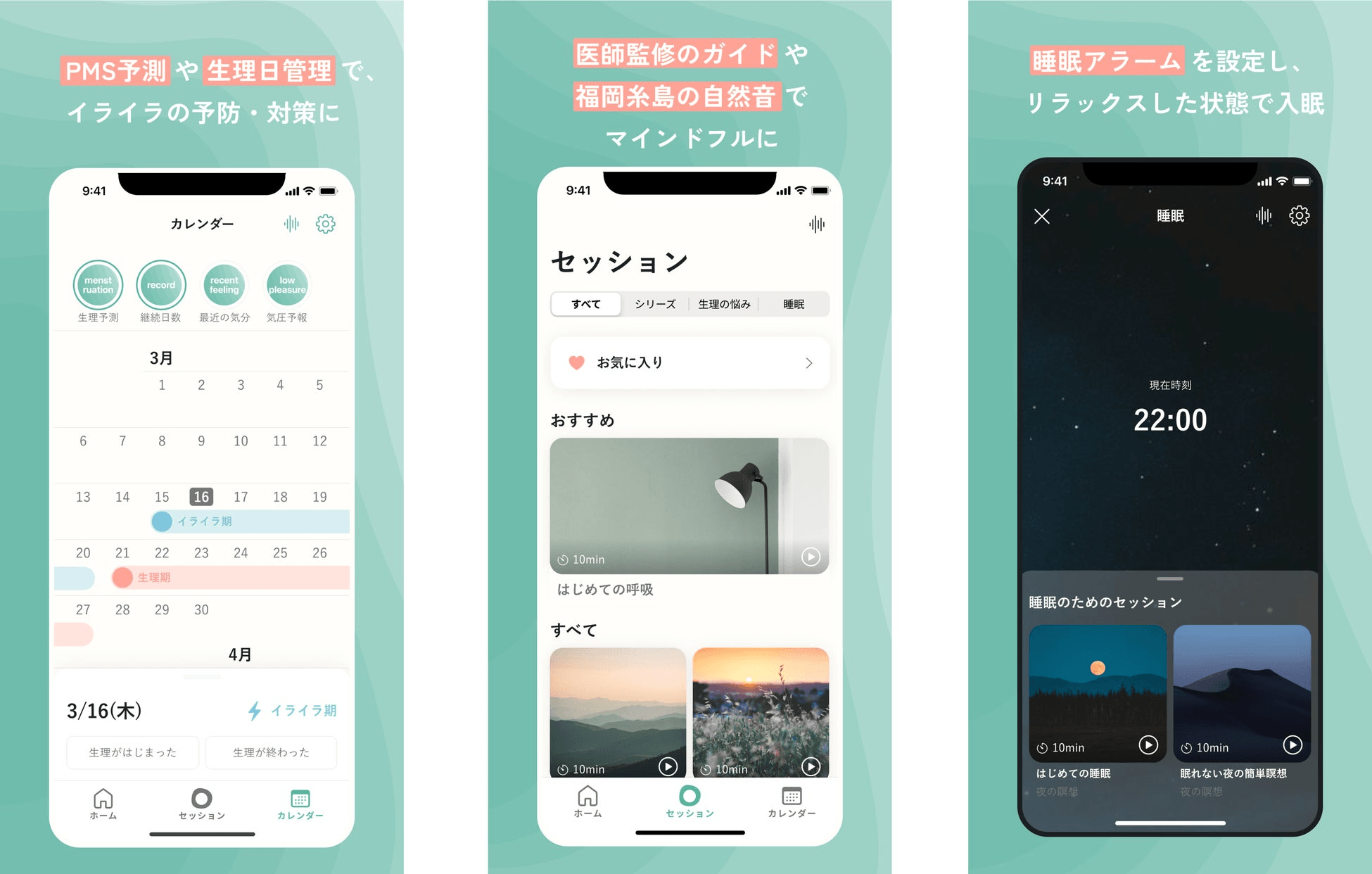 自分の体や心のパターンに気づくきっかけを作り、”自分が悪””自分のせいだ”と言う気持ち(心)と体の不調と切り離して、自己嫌悪を止めてもらえるきっかけに。背景で自然音が自動で流れるのを聴きながらリラックスした状態で、手軽に記録できるよう設計した、5つの感情スタンプで気分のログを取り、生理周期や体調を記録する機能を搭載。また普段、人目を気にして自分の時間がないと感じる方や、寝不足の子育て中のママに夜寝る前の5分間だけでも、自分を大事にする時間を作るお手伝いをします。