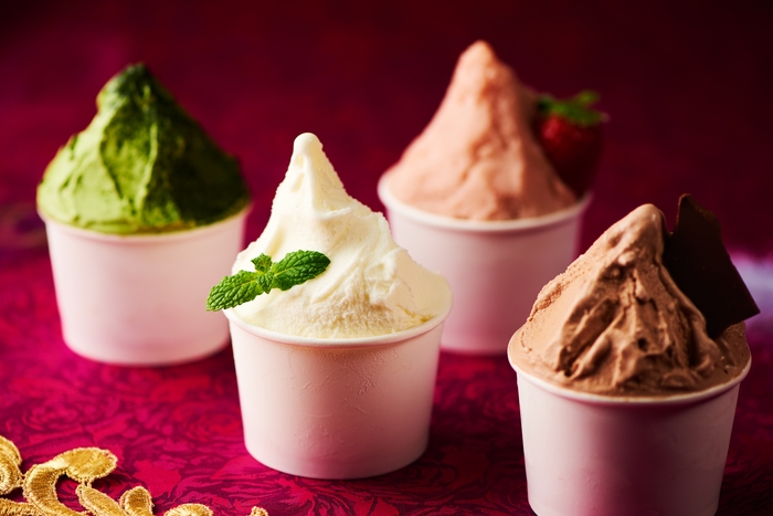 必ずお召し上がりいただきたい今回のメニューは、ひとつひとつホテルでつくる「ジェラート」。ミルク、イチゴ、チョコレート、抹茶の4種類をご用意いたします。どれもオーソドックスなテイストですが、そのこだわりはレシピにあります。アジア初のジェラート世界チャンピオンである柴野大造氏監修のもと、濃厚ながら繊細な味わいを実現。ぜひ全種類の味をコンプリートしていただきたい、ディナーブッフェおすすめの一品です。
