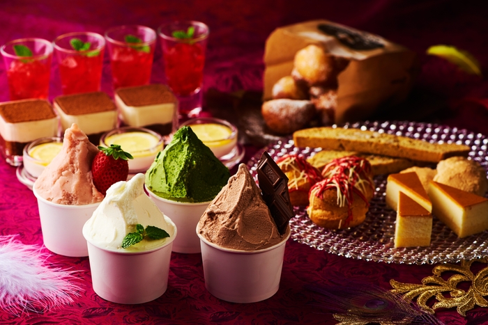 揚げたてフリッテッレ、ジェラート各種、ティラミス クラッシッコ、パッパビアンコ、ビニェアラクレーマ(シュークリーム)、ベークドチーズケーキ、アマレッティ、ビスコッティ、他