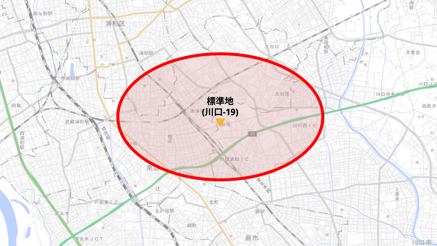 今回は、標準地(川口-19)周辺の下記エリア内のマンション事例①(築10年~19年)、マンション事例②(築20年~29年)、マンション事例③(築30年~45年)を対象に、過去5年の一般市場価格を抽出します。