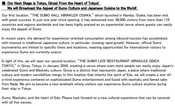 “THE SUMO LIVE RESTAURANT HIRAKUZA GINZA TOKYO” is a permanent entertainment show restaurant for the inbound tourist market, themed around Sumo and Japanese cuisine (Washoku). Following “THE SUMO HALL HIRAKUZA OSAKA,” which opened in Namba, Osaka in May 2024, this second domestic location will launch in Ginza, Tokyo in January 2026. In advance of this, ticket sales will commence on Friday, August 1, 2025.