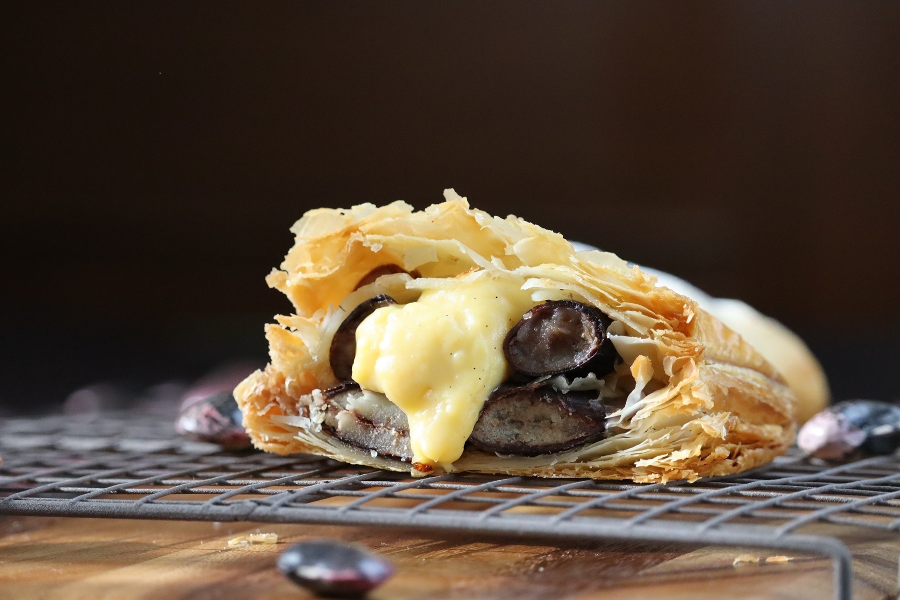 乾燥した花豆を1日水につけて戻し、下茹でした後、砂糖や水、群馬県産の醤油を少し加えたシロップで数時間煮込んでいきます。ふっくら艶やかに煮あがった花豆を64層のオリジナルパイシートで包み、パイ専門店のデッキオーブンで焼き上げます。そして焼きたての花豆パイに後入れで自家製のカスタードクリームを詰めたあと、もう一度オーブンで2次焼成をすることで、大粒の花豆とトロトロのカスタードクリーム、サクサクのパイ生地を一度に楽しめるパイが完成。