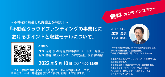 5月10日(火)無料オンラインセミナー開催 不特法に精通した弁護士が「不動産クラウドファンディング」の 事業化を検討する不動産事業者に向けてポイントを解説