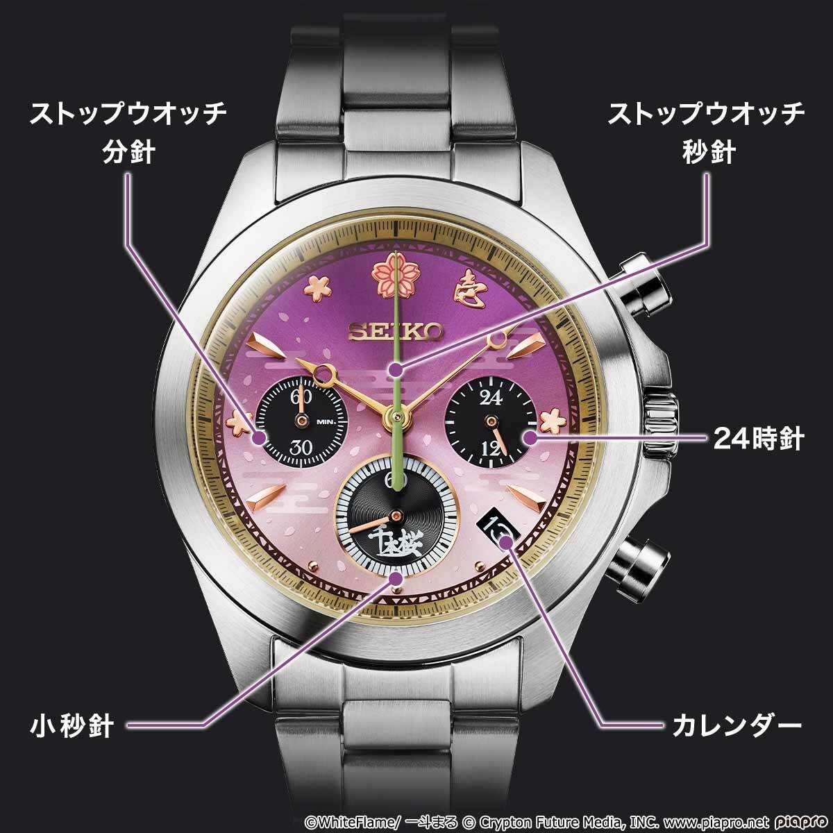 『千本桜』のMVに登場する“初音未來”の衣装をイメージした文字盤は、スモーキーな紫と桜色のグラデーションカラー。桜の襟章や「壱」の文字、舞い散る桜、エ霞文様(えがすみもんよう)など、細部に至るまでこだわりを尽くしたデザインとなっています。