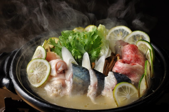 夕食は、大分県の名産品「かぼす」を使った麺をアレンジした先付や、旬の魚介を使ったお造りなど、 ご当地の素材をいかした会席料理を提供いたします。また、先付をはじめ、酢の物・八寸・お造りを一緒に盛り合わせた華やかな宝楽盛りでは、大分県の伝統工芸品である小鹿田(おんた)焼きの器や竹細工とともに楽しめます。そして、特別会席では、メインの台の物に「豊後なべ」を提供します。近海で獲れた魚介と、鶏肉・牛肉を組み合わせ、鶏肉の出汁でじっくりと煮込みました。濃厚なスープに「かぼす」を入れることで、濃厚な味わいの中にも爽やかな風味を味わうことができる一品です。食事はプライベートが保てる半個室の食事処で、ゆったりと楽しめます。