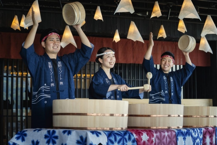 界ブランドのおもてなしの一つ、ご当地の文化を体験する「ご当地楽」。日本一の源泉数・湧出量を誇る別府温泉。かつて別府港が開港し、湯治客で賑わう別府の夜は、流しのギター弾きが闊歩し、オールデイズバンドを楽しむ空間など賑やかな音楽に彩られました。この歴史にちなみ、界 別府のご当地楽は、法被をまとったスタッフが、豊富な温泉と桶から生み出された音色を奏でる「湯治ジャグバンド」です。館内で夜の温泉街の賑わいを演出します。