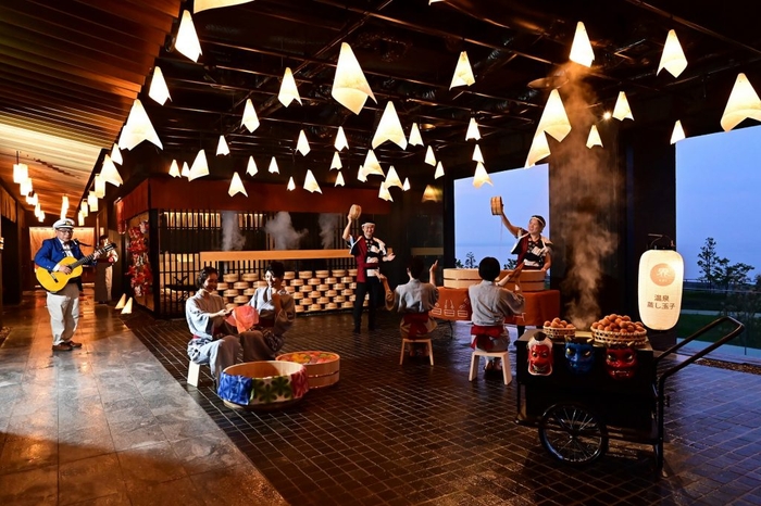 日本一の源泉数及び湧出量を誇る別府温泉。界 別府は、明治時代に旧別府港が開港して以降、日本全国から多くの湯治客が訪れた歴史ある北浜地区に位置しています。別府湾の玄関口、旧別府港を中心に温泉街が発展し、夜遅くまで人々で賑わう様子は「不夜城(ふやじょう)」と例えられてきました。湯治客が賑やかな温泉街をそぞろ歩きする様子を彷彿させる空間で、館内に石畳の路地や夜店をイメージしました。人々が集う広場をイメージした「湯の広場」では、昼から夜、翌朝にかけて、スタッフが演奏するご当地(ごとうち)楽(がく)や「別府温泉絞り体験」など様々な体験ができます。また、ご当地の文化を感じる客室での時間や、豊富な湯量を感じる大浴場、ご当地の旬の素材をいかした会席料理、温泉の配管をモチーフにした「ラボ」での体験など、館内にいながらもドラマティックに移り変わる温泉街に逗留することができます。