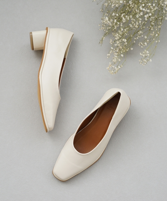 甲が深いデザインで、シンプルな中にもこだわり感が漂います。三角形のヒールが個性を出すポイント。
