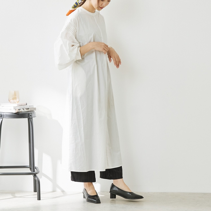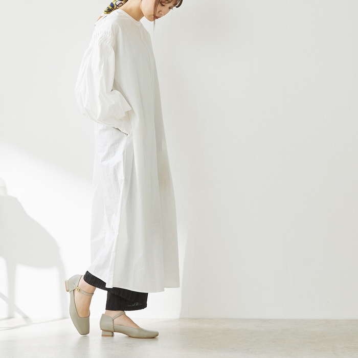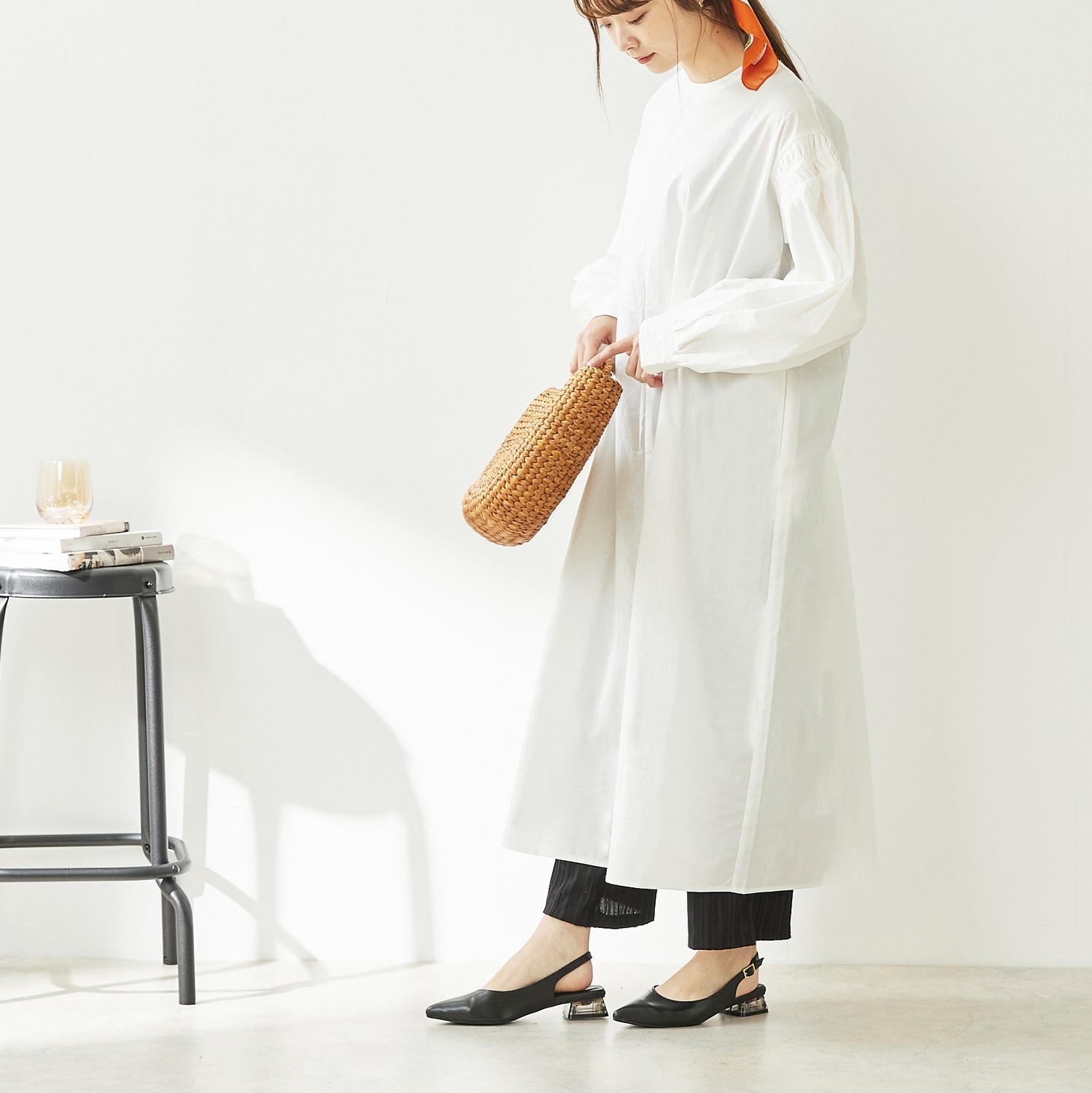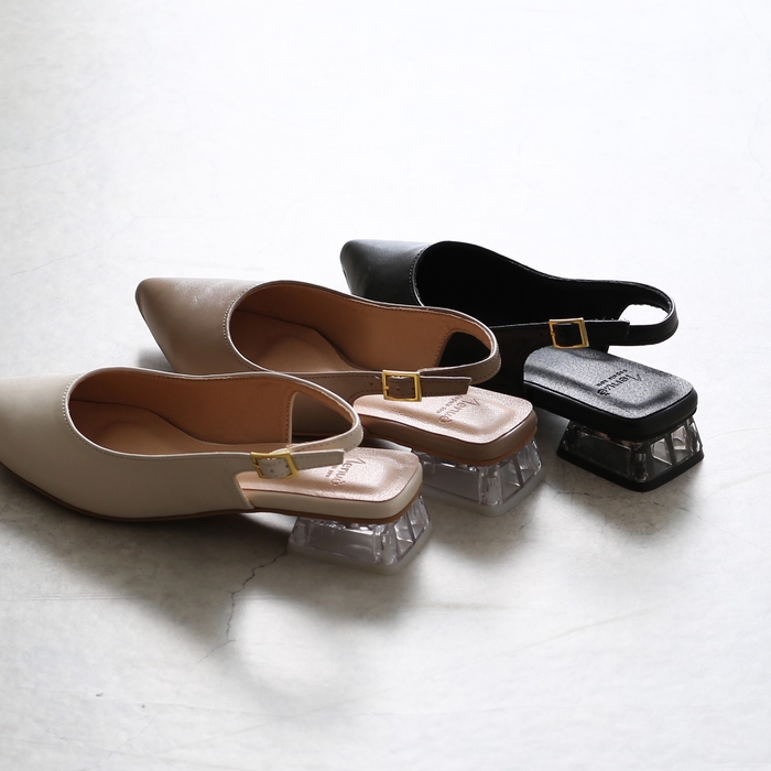 今年も注目のクリアヒール。ローヒールならボリュームが少ないので、さりげなくコーデに取り入れる事ができます。バックストラップと相まって、抜け感のバランスが印象的な一足です。