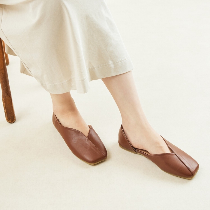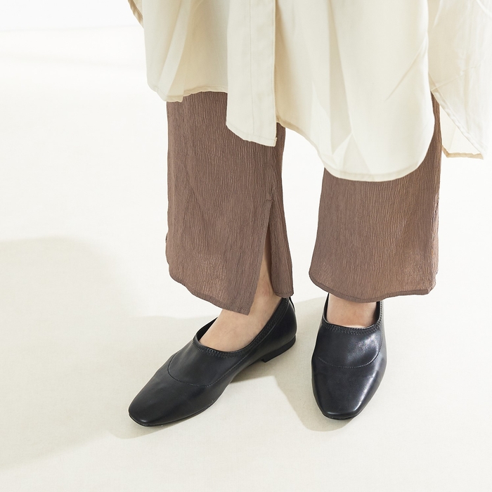 ぺたんこのラフ感と、サイドカットの女性らしさをあわせもった1足。135gと軽量さがポイントで、さっと履きでおしゃれが叶うのが嬉しい。