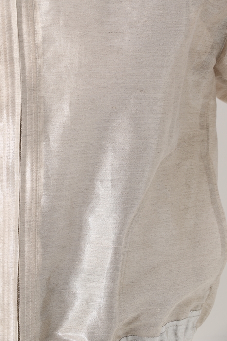 ・衿元や袖口にはメタリックなリネンの別布を使用し、ナチュラルな亜麻色をシャープに引き締めました。