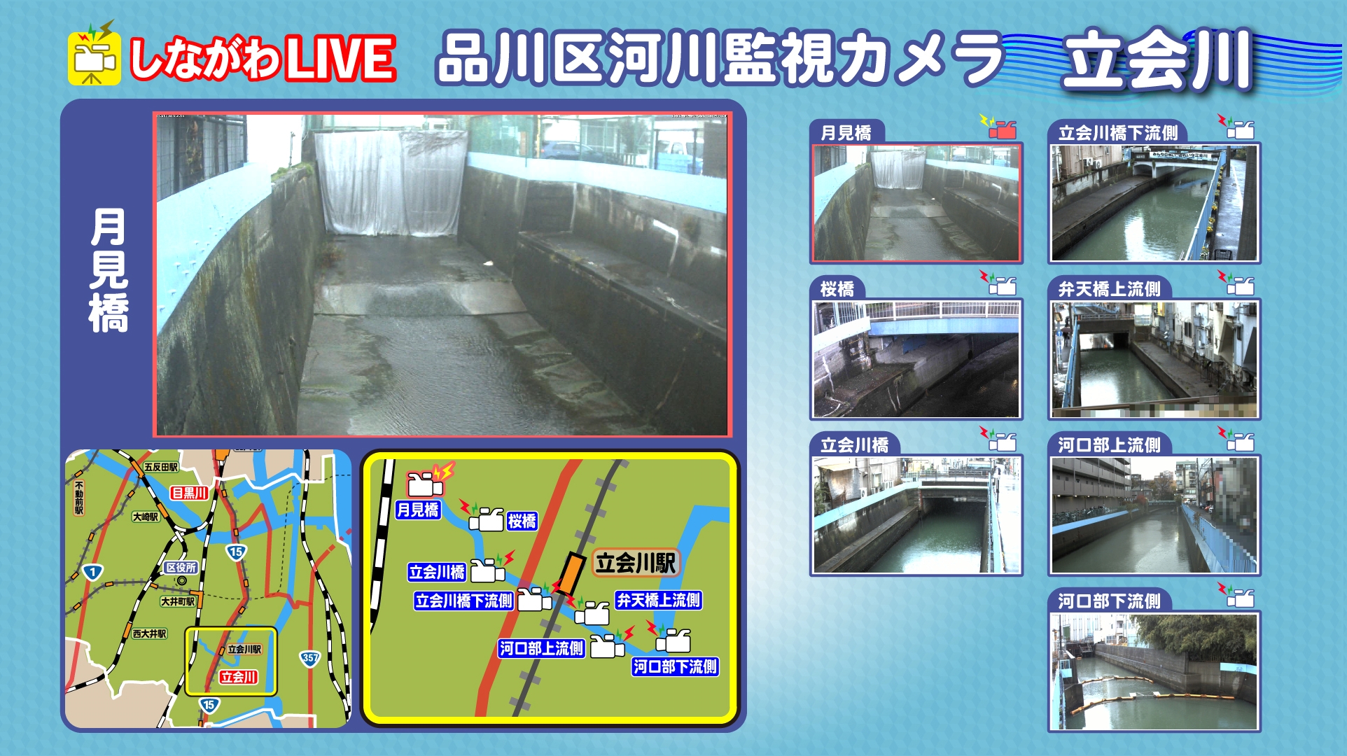 品川区では、区内の目黒川および立会川流域で、過去に集中豪雨等で大きな浸水被害があったことなどを受け、対策事業の一環として河川監視カメラを設置しています。