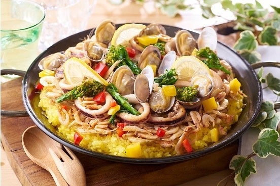 国内生産量の8割を担う、大分県竹田市のサフランを使ったパエリア。合わせる具材は九州産の桜えびをはじめとした豊富な魚介類。華やかな見た目はもちろん、魚介の旨味が染みた米粒がしみじみ美味しいご馳走ご飯です。