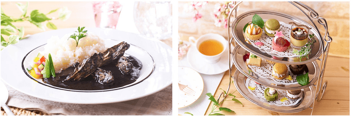 左:黒がテーマの「熊本産大阿蘇どりの漆黒カレー」。手羽先やささみなど大阿蘇どりの様々な部位を、飴色になるまで炒めた玉葱と共にじっくり煮込んだカレー。真っ黒なビジュアルからは想像のつかない、豊かなスパイスの香りと深い味わいをお楽しみください。