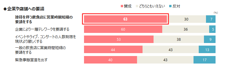 接待を伴う飲食店への営業時短要請や企業のテレワーク推進については、6割以上が賛成。