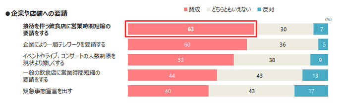 企業や店舗への要請としては、「接待を伴う飲食店への営業時短要請」や「企業のテレワーク推進」の他、「イベントやライブ、コンサートの人数制限強化」に賛成という回答が過半数を超えたが、「緊急事態宣言」については賛成が4割にとどまった。