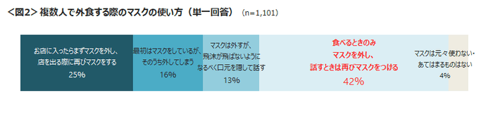 複数人での外食時には、「マスク会食(食べるときのみマスクを外し、話すときは再びマスクをつける)」が42%にのぼる。