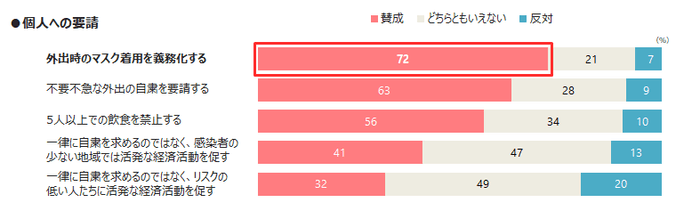 個人への要請としては、「マスク着用の義務化」に賛成が72%、「不要不急な外出の自粛」に賛成が63%となっている。一方、「一律自粛ではなく、感染者の少ない地域/リスクの低い人に活発な経済活動を促す」といった意見への賛成は半数を下回る結果となっている。