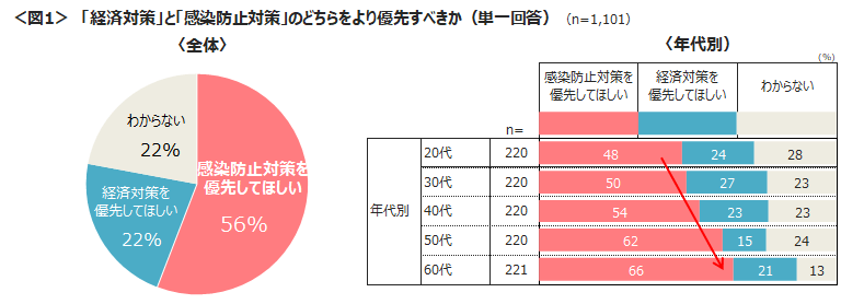 新型コロナの拡大に際して、経済対策と感染防止対策のどちらを優先すべきだと思うか聴取したところ、「感染防止対策を優先してほしい」が半数以上。年代が高くなるほど、 「感染防止対策優先」の声が高まる。<図1>