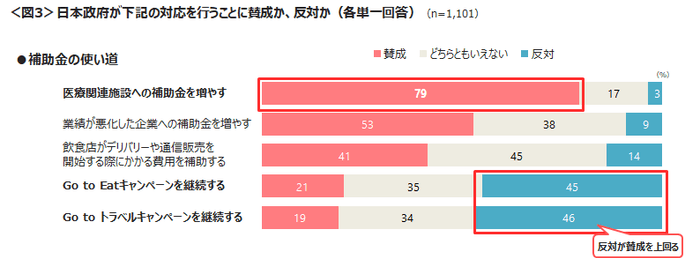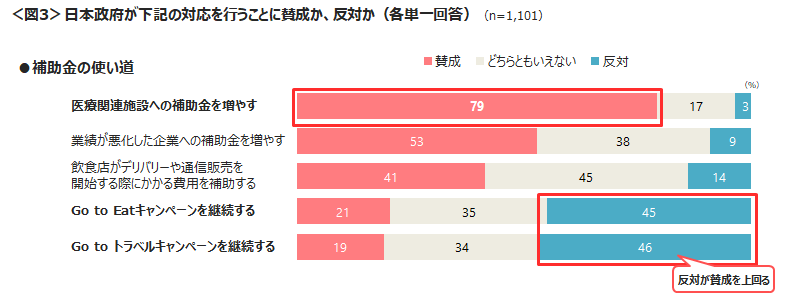 補助金の使い道として、「医療関連施設への補助金を増やす」に賛成が79%と多くの票を集めた。