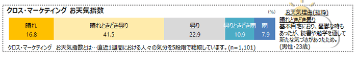 クロス・マーケティングお天気指数とは、直近1週間における人々の気分をお天気で表したものです。お天気の理由も一部抜粋してお知らせします。
