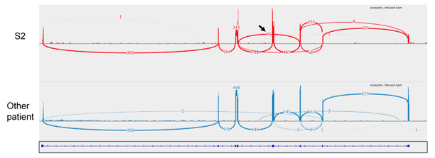 今回、ミトコンドリア病の未解決症例を対象として、マルチオミクス解析を行いました。対象となる症例はミトコンドリア呼吸鎖Iの異常を呈しており、生化学診断によりミトコンドリア病とされていました。従来のゲノム解析方法である全エクソーム解析を用いて原因探索を行い、NDUFV2遺伝子にヘテロ接合のc.580G>A(p.Glu194Lys)の遺伝子異常を有することを見い出しました。この遺伝子異常は、ヘテロ接合の状態では病的原因と考えられないため、さらなる遺伝子異常が存在することが示唆されました。そこで、RNAシーケンス(RNA-seq)と全ゲノム解析を実施し、遺伝子異常の探索を行いました。その結果、RNAシーケンスのデータから遺伝子発現の偏り(図1)があること、およびエクソンスキップが起こっていることを発見しました(図2)。