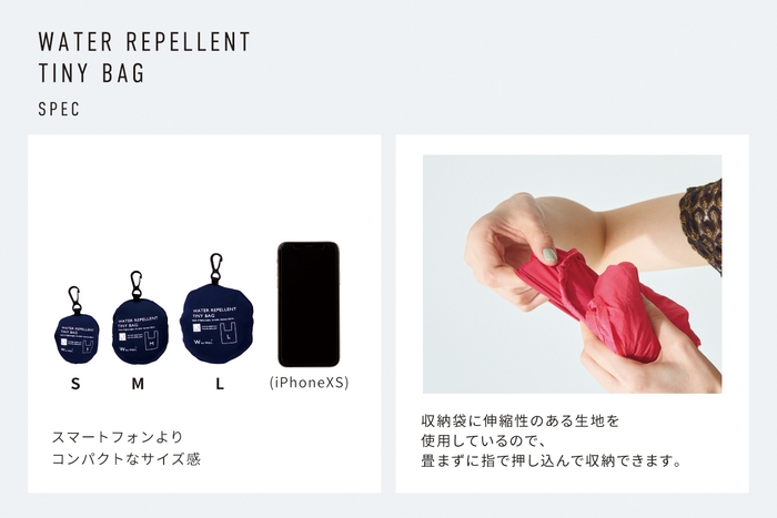 スマートフォンよりコンパクトな手のひらサイズで、カラビナも付いているので持ち運びに便利。エコバッグは畳むのが面倒・・・という方も多いですが、タイニーバッグに付いている収納袋は伸縮性のある生地を使用しているので畳まなくてもクシャッと押し込むだけでOK。収納袋はタイニーバッグ本体と一体化しているのでなくす心配もなし。もちろん生地に防水・撥水加工も施されています。
