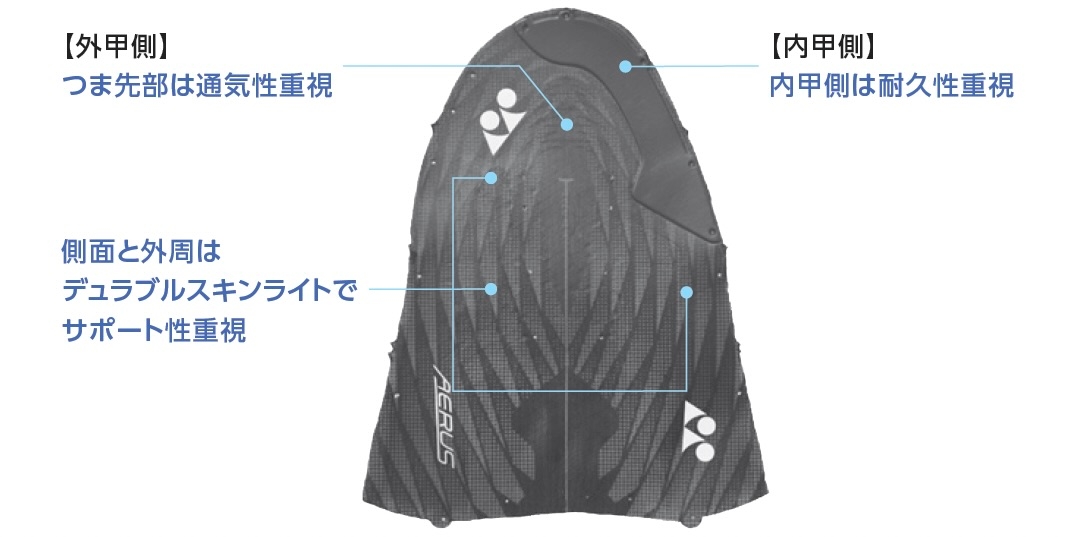 ミッドソール全体には、ヨネックス史上最軽量※2のミッドソール素材「フェザーライト エックス」を採用することで、弊社バドミントンシューズ史上最軽量を更新しました。アッパーは、リサイクルポリエステル100%のダブルラッセルメッシュにデュラブルスキンライトを圧着し、部位ごとに耐摩耗材及びフィルムで補強した「シームレスアッパー設計」により、軽量性と高い通気性、サポート性を実現しています。